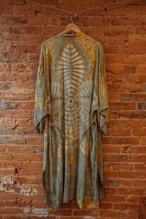 Large lotus tie dye flower centered on the back, and smaller flowers on the front. Wide sleeve intricately dyed plant based rayon kimono or duster with front pockets and low waist tie for a customizable look and functionality. Perfect as a boho chic outfit topper, this duster will fit individuals XS-4XL.
