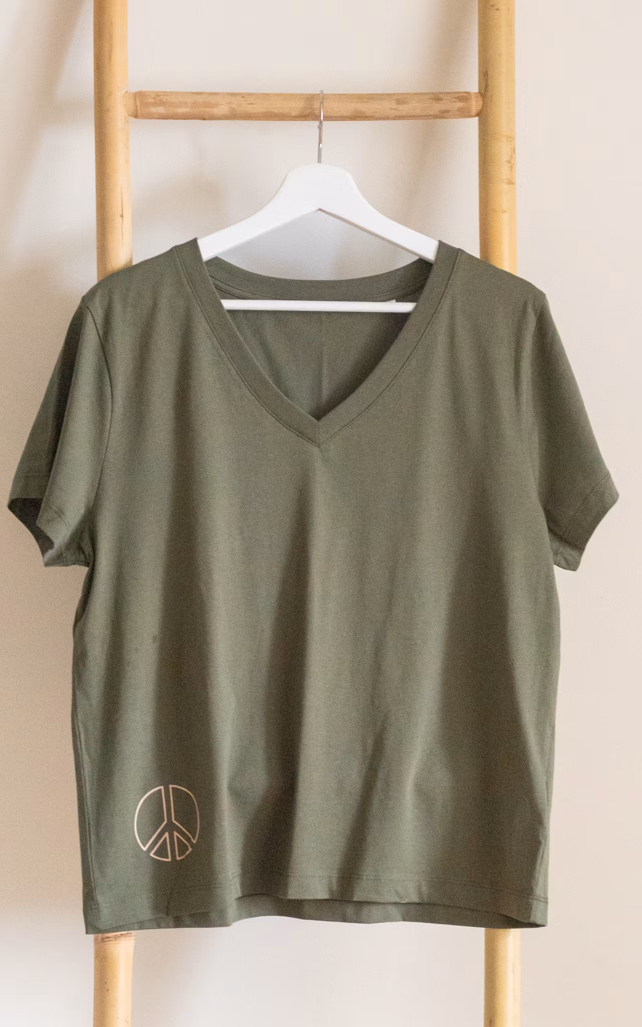 Den snygga khakigröna nyansen på den här medium fit t-shirten är perfekt att bära hela året runt. Framtill är ett peacemärke tryck i en snygg beige nyans. T-shirten är mjuk, bekväm och lika fin att bära med favoritjeansen, som till yogatights eller shorts för att skapa en avslappnad look. Oavsett vilken stil du väljer så kommer du att se fantastisk ut.