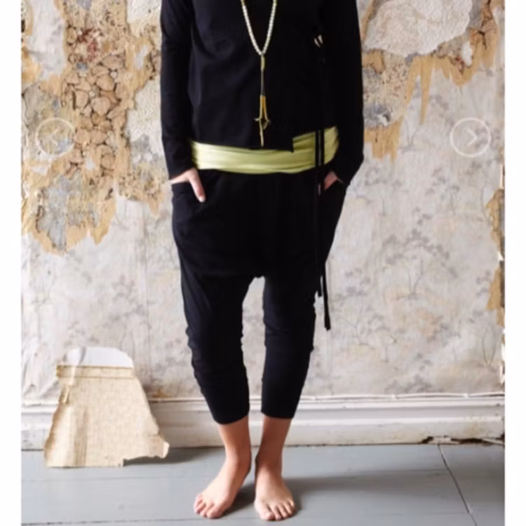 Den omåttligt populära byxan Santosha från svenska Santa Ni, nu i färgen svart Baggy modell med smal fotvidd, tillverkad av Svenskvävd ekologisk trikå. Passar väldigt fint till tröjorna från Santa Ni. Byxan töjer sig något efter anvädning.