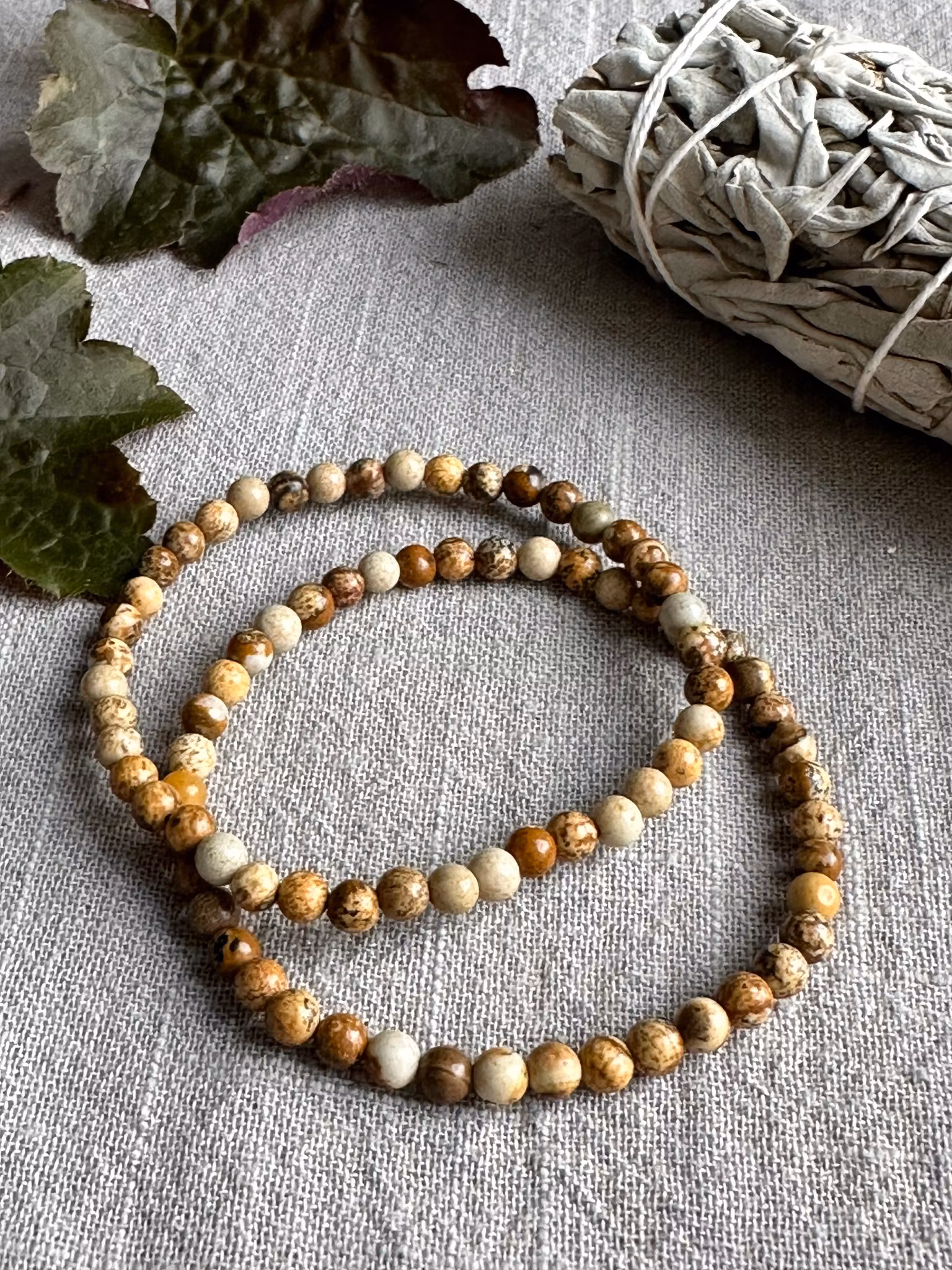 Armband med 4 mm halvädelstenar Landskapsjaspis innehåller gudinneenergier som kan nås genom inre resor. När du reser med dessa stenar kan du färdas genom jordens medvetande och ta dig till nivåer av energiplan där du kan se helheten såsom universum utvecklat den.